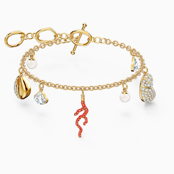 This charm bracelet by Swarovski is a maritime beauty with a touch of glamour. It features several seashell charms and white Crystal Pearls on a gold-tone plated, twisted chain. A shell, a coral element and a sparkling nautilus shell are set next to one a