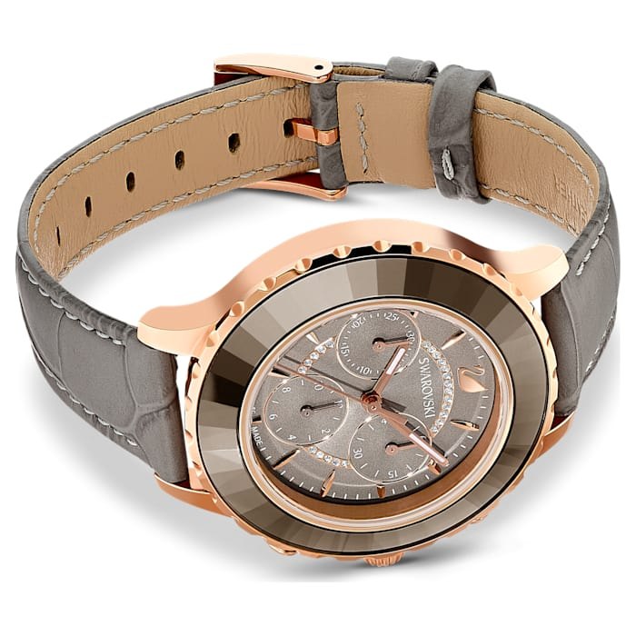 Blending classic Swiss watchmaking with Swarovski's crystal expertise, this luxurious new chronograph watch brings together precision, luxury, and craftsmanship. Perfect for everyday wear, it features a stopwatch function with accumulated and interval timing. The rose gold-tone coated stainless steel case harmonizes beautifully with the faceted gray crystal bezel exclusive to Swarovski watches, the warm gray sunray dial, and the gray crocodile-embossed genuine leather strap. Case: 39 mm, water resistant to 50 m, Swiss Made.