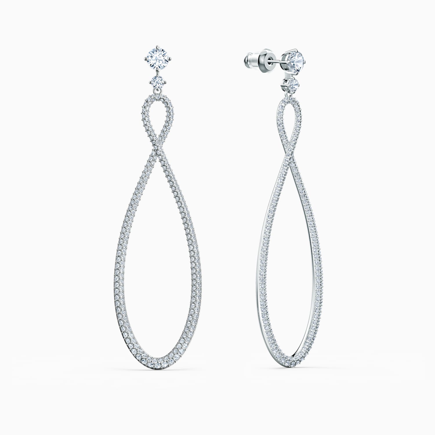 Timeless design with a hint of modernism: This pair of Swarovski earrings are inspired by the infinity symbol with a smaller upper loop, creating a stylish hoop look. They are studded with numerous sparkling Swarovski crystals that refract incoming light.