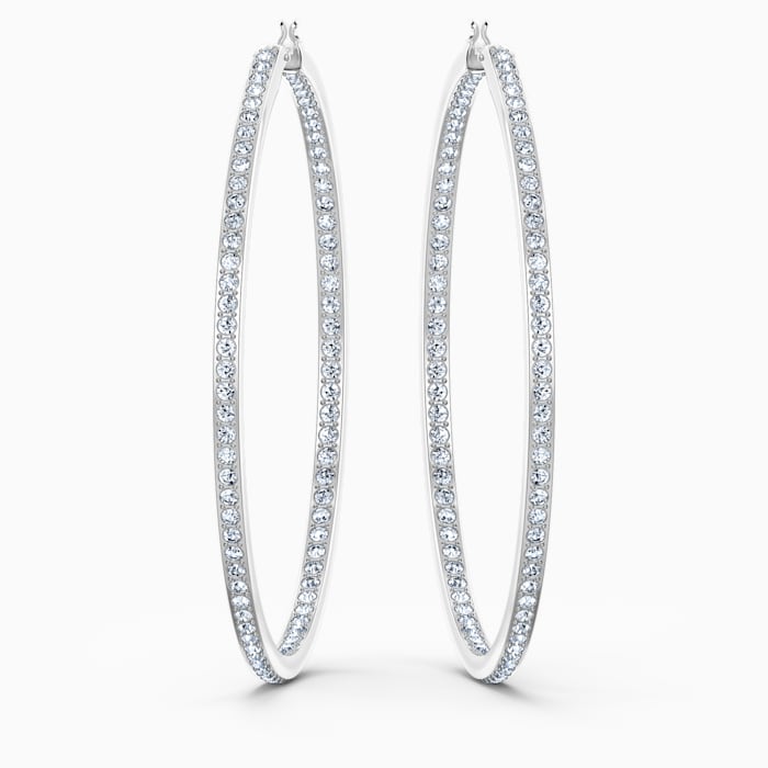 This pair of pierced hoop earrings by Swarovski is characterized by its simple beauty. Each hoop is set with sparkling, clear crystal pavé in an alternating pattern, with gleaming crystals partially adorning both the outside and inside of the hoop for a pure yet stylish look. These earrings match many different styles easily: a great addition to your jewelry box.