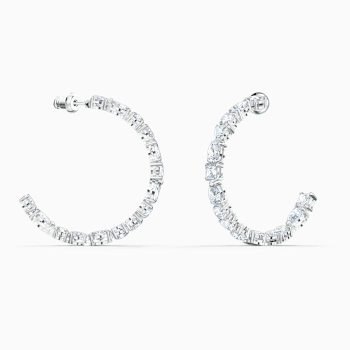 This pair of pierced earrings by Swarovski is characterized by simple silhouettes and resplendent elegance. Each hoop is formed by a row of gleaming white stones, expertly cut into sparkling, faceted round, square, trillian, and drop shapes. A timeless addition to your everyday look, these earrings are easy to combine with matching pieces of jewelry. A beautiful gift giving idea.