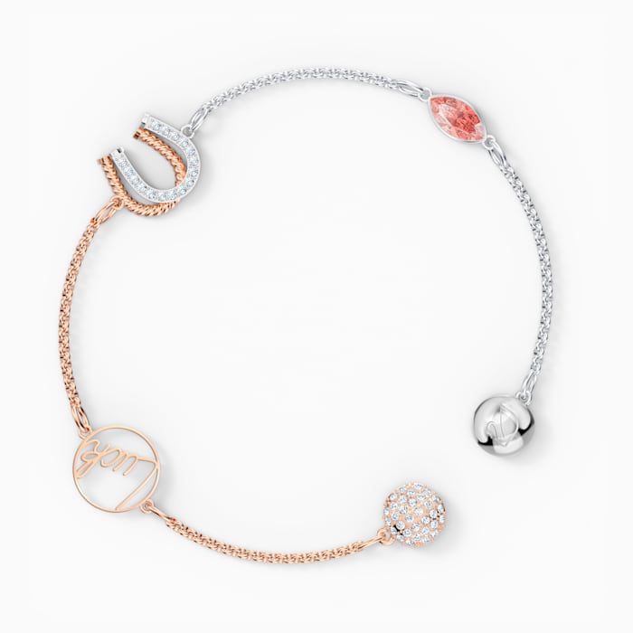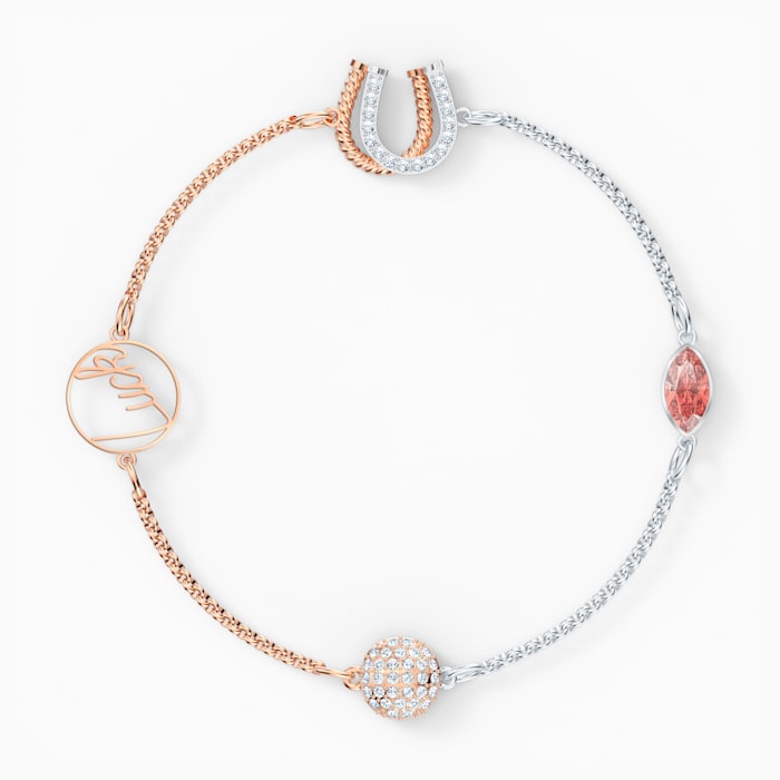 Thistrand from thewarovski Remix Collection is an on-trend good-luck talisman withodern appeal. Adorning the chain are twin horseshoes, the gleaming word 'Luck', and aparkling red crystal, complemented by aagnetic closure covered in clear crystal pavé. Itsleek,imple designakes this fashionabletrand ideal for creatingany differentooks byixing andatching it with othertrands from thewarovski Remix Collection into chokers, necklaces, or double-wrapped bracelets – numerous possibilities for your uniquetyle. Given for gooduck, it is also a creative gift.