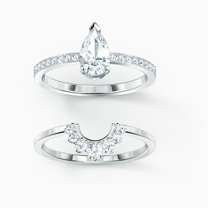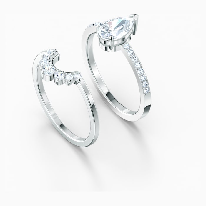 This Swarovski ring is an artful display of expert craftsmanship. A gleaming white, drop-shaped stone is the centerpiece of the design, while additional stones resembling a sparkling crown adorn the ring. The ring itself consists of two separate bands, one partially covered with sparkling pavé. These beautiful details and its refined look make this ring ideal for dressing up everyday styles.