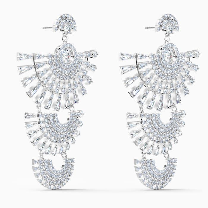 This ravishing pair of pierced earrings by Swarovski is a striking example of expert craftsmanship and faceted brilliance. Each of these marvelous earrings displays numerous sparkling white stones and clear crystals in three fan-shaped arrangements, one featuring a gleaming white dancing stone in its center. Dangling from a fourth, smaller glittering fan shape, this pair of earrings reflects incoming light brilliantly into a spectacular display of sparkles. Wear this talking piece with the matching necklace and bracelet and you are certain of a grand entrance at special occasions.