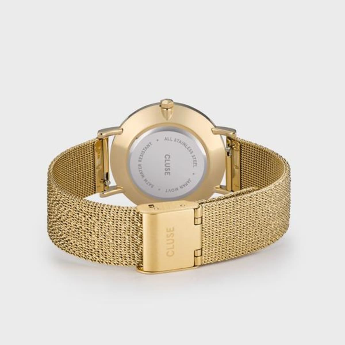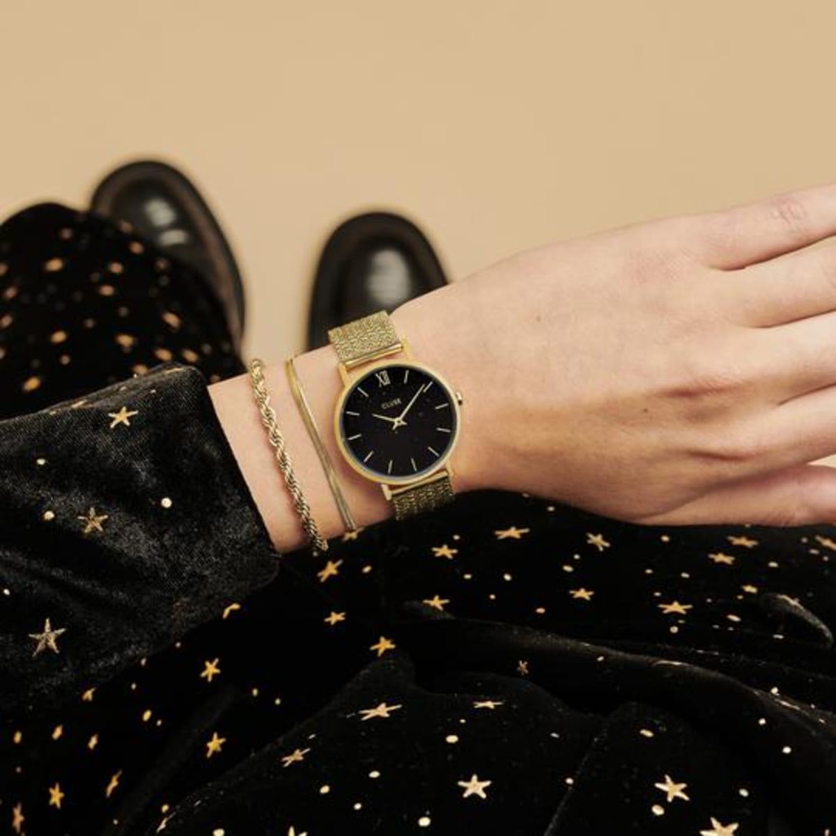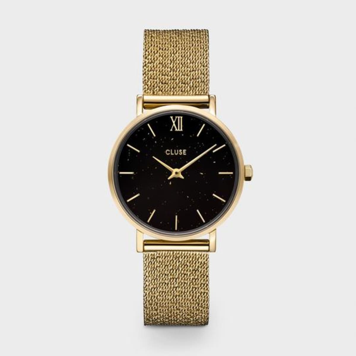 This gorgeous CLUSE gift box combines the gold coloured minimalist Minuit, with an additional black leather strap. This gold coloured Minuit watch has a special mesh strap and a stunning black dial adorned with gold coloured flecks. All Minuit watch straps are interchangeable, so you can easily customise your stainless steel case to match your mood. Style your day in a gorgeous gold colour or switch to sophisticated black. Presented in a modern geometric pattern gift box.