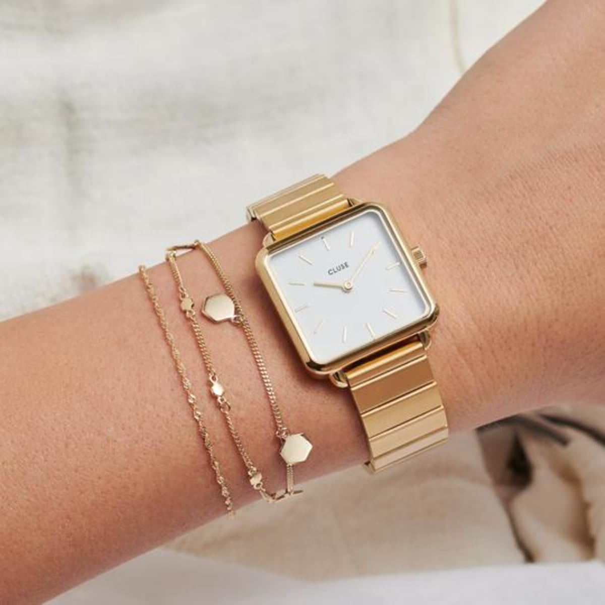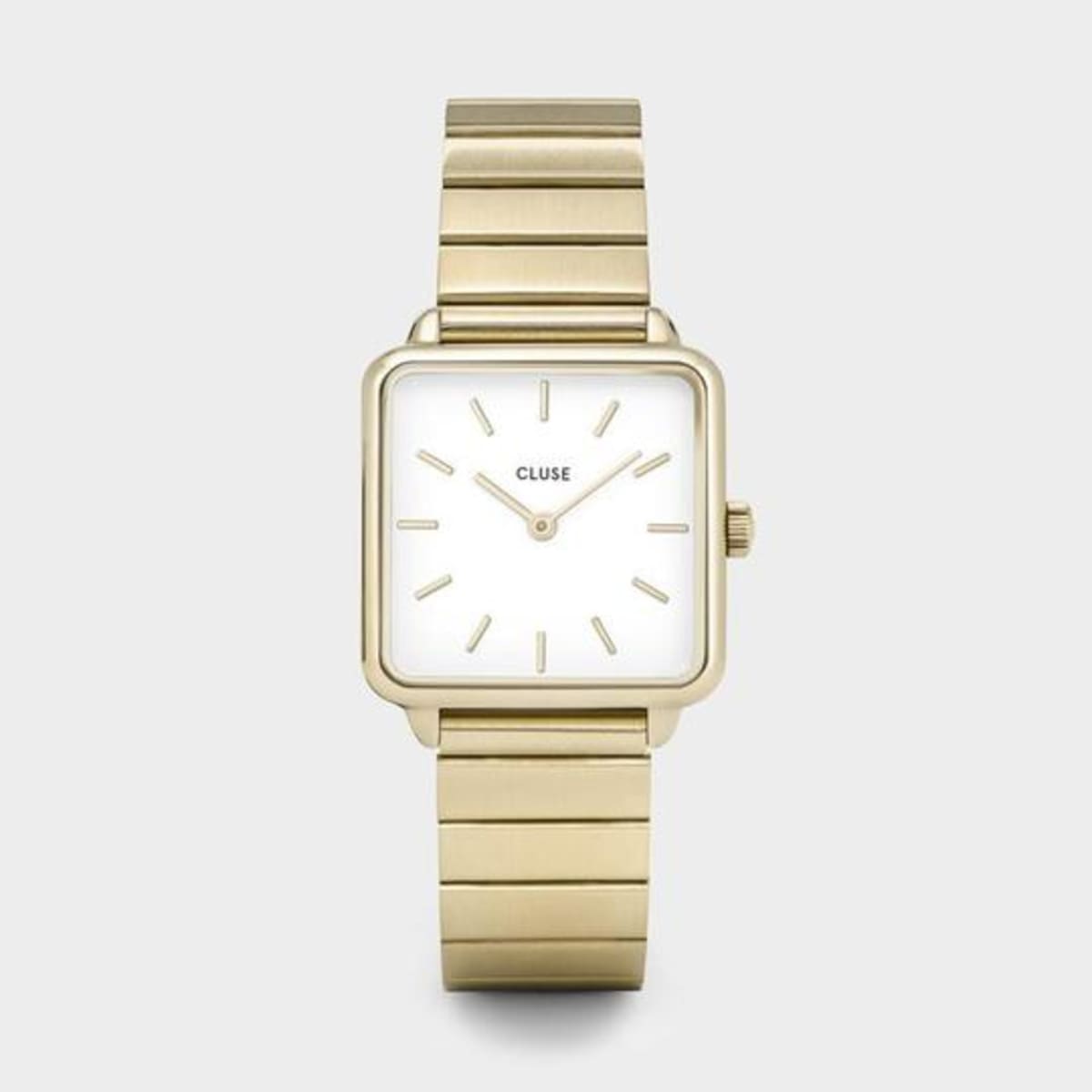 Square case, rounded edges, clean uncluttered face. La Tétragone is a play on line, shape and form. Combining androgyny with elegant feminine touches. The La Tétragone combines a classic white face and gold single link straps for the perfect blend of timeless yet contemporary design. As with all our watches in the La Tétragone collection, the straps of this watch can be interchanged with any 16 mm CLUSE watch strap.