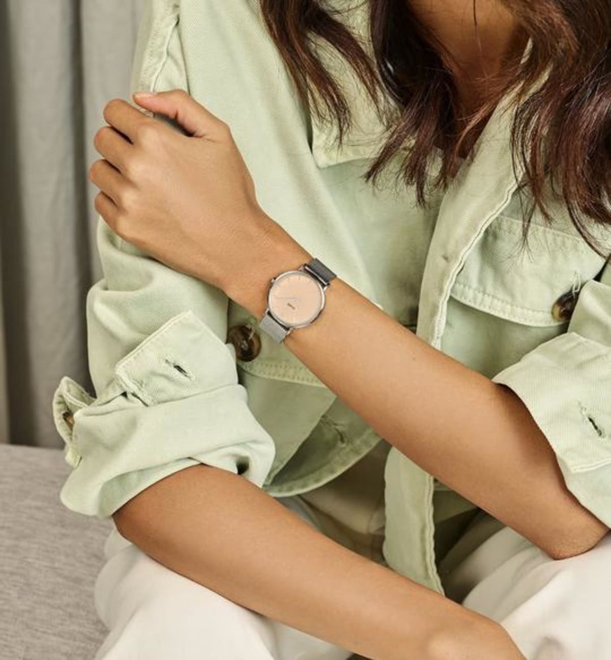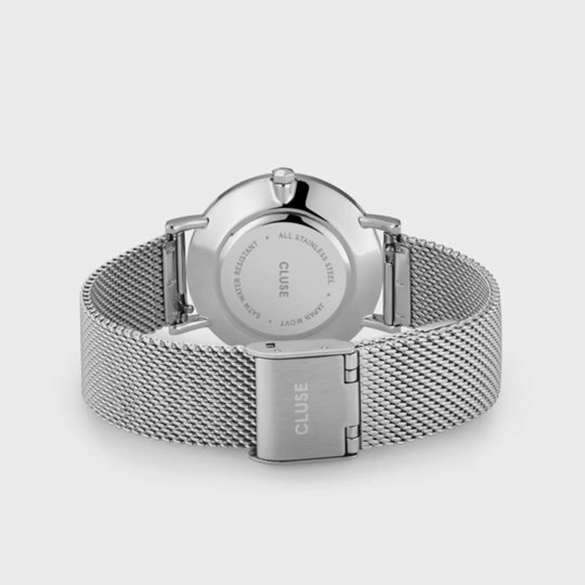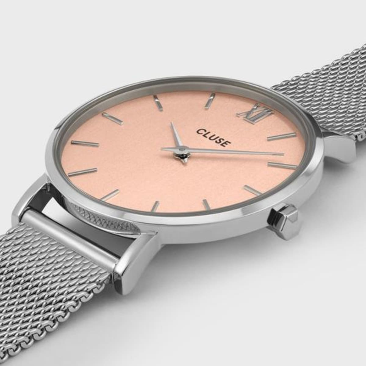 An all-time CLUSE classic. With its 33 mm case, our Minuit collection is your perfect companion regardless of the size of your wrist. This silver coloured watch, with a special rose gold brushed dial, will make you stand out from the crowd in a fashionable manner. No unnecessary details, but playful and refined. With its stainless steel case and mesh strap, it's built to last. As with all Minuit watches, you can easily interchange the strap with any 16 mm CLUSE watch strap.