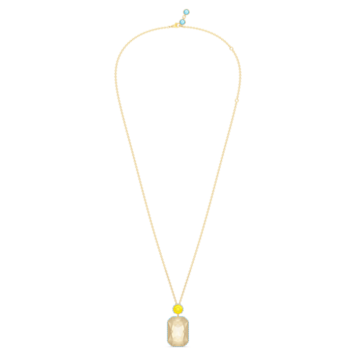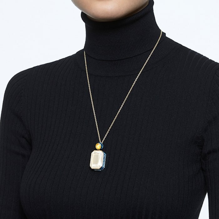 This necklace is a meticulous exploration of color. With its innovative hinge mechanism, you can swivel the rectangle cut crystal pendant to reveal a creamy ivory or buttercup yellow side, depending on your mood. Framed with contrasting blue stones, it’s suspended from a sleek gold-tone plated chain. Style with other pieces from the Orbita family for a show-stopping finish. This necklace is part of the Orbita family, designed by Creative Director Giovanna Engelbert for Collection I